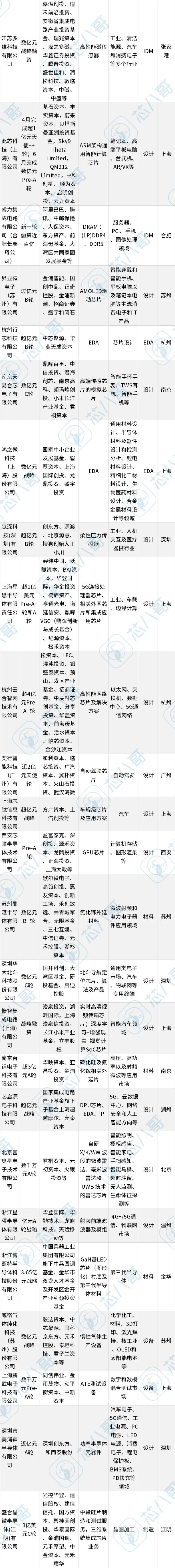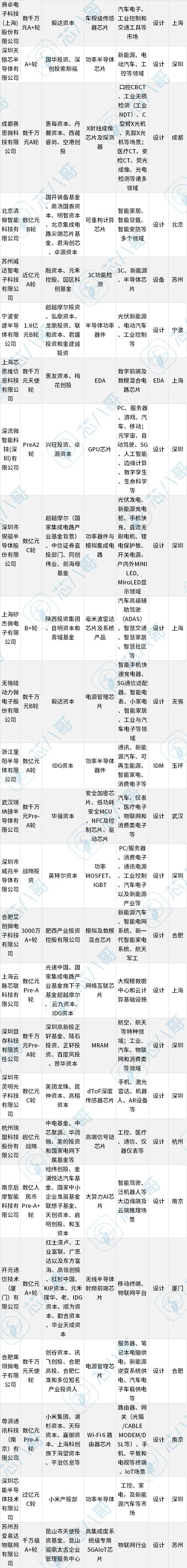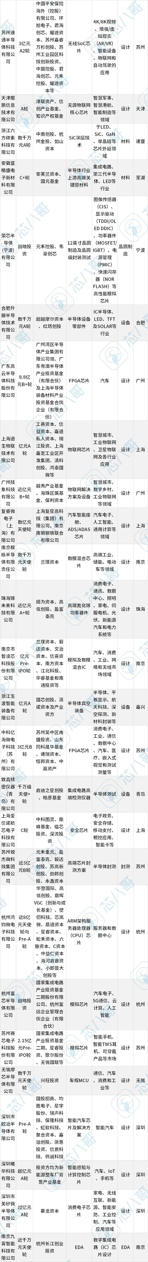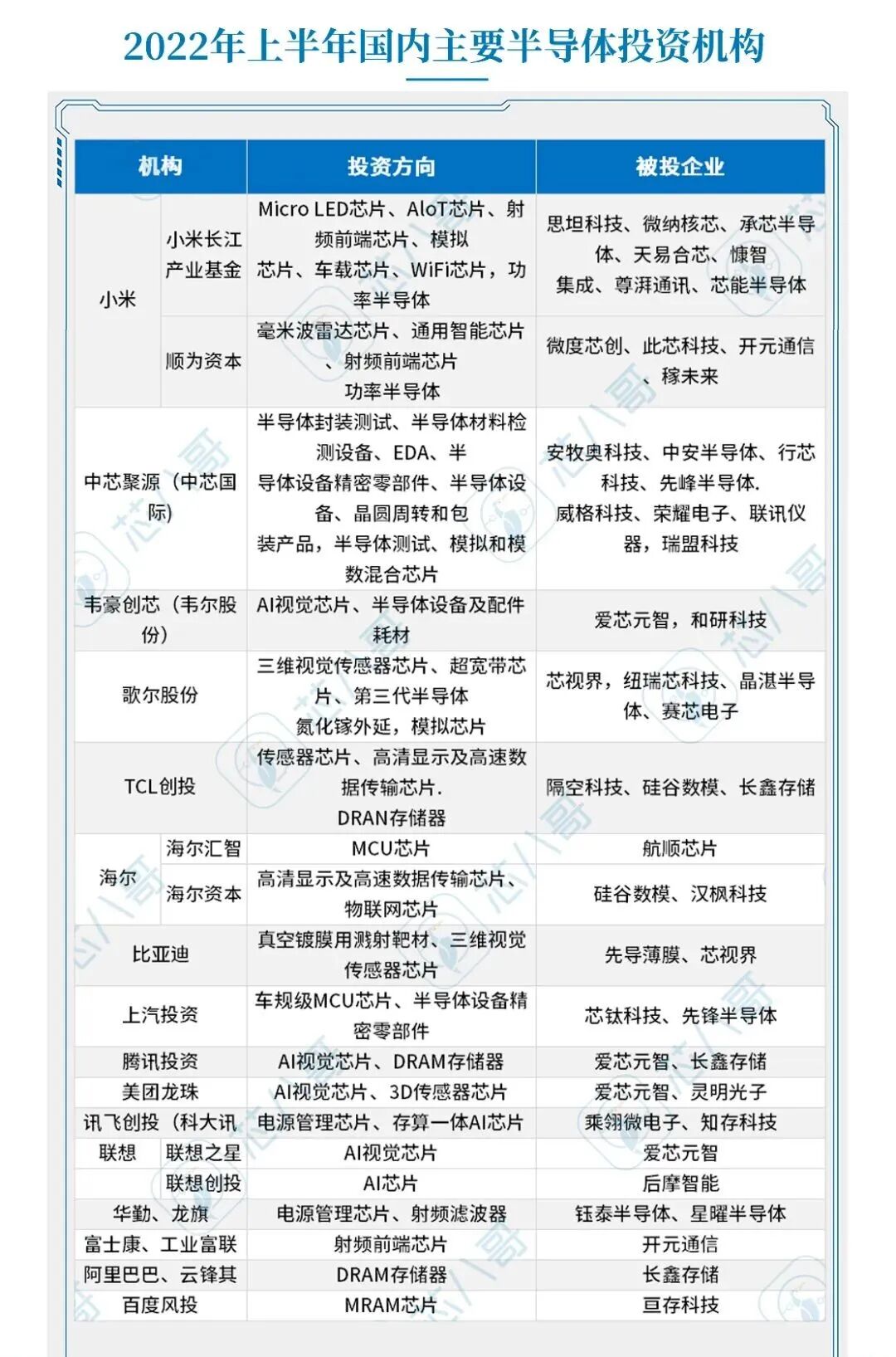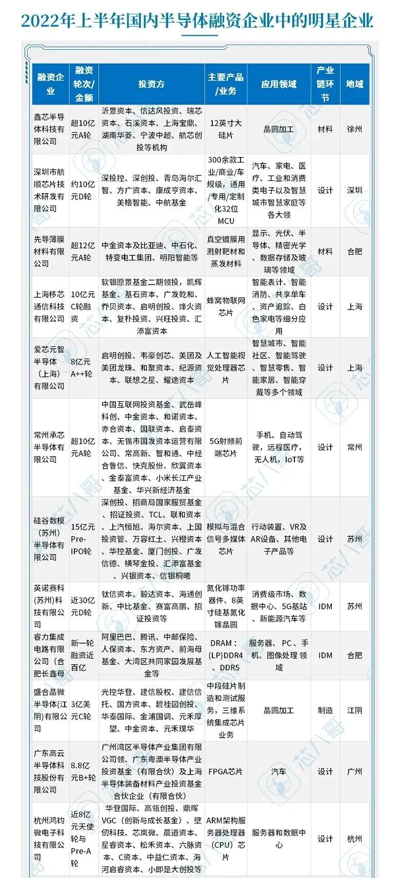 2022 年上半年金额最大的融资事件,当属长鑫存储的 C+ 轮融资,虽然未公布详细的金额,但据预测为超 100 亿的规模。其背后的投资机构包括阿里巴巴、云锋基金、TCL 创投、腾讯投资、深投控、中邮保险、君和资本、华登国际等等。长鑫存储已成为国产 DRAM 存储芯片领域又一龙头企业。其次是英诺赛科,其 D 轮融资收获 30 亿人民币,该公司的主业正是近年来火爆的第三代半导体硅基氮化镓。除了第三代半导体外,先导集团的子公司先导薄膜则聚焦另一种半导体核心材料——真空镀膜用溅射靶材,其获得了比亚迪、中金资本、中石油资本等机构的 12 亿下注。资料来源:各公司新闻,芯八哥整理
