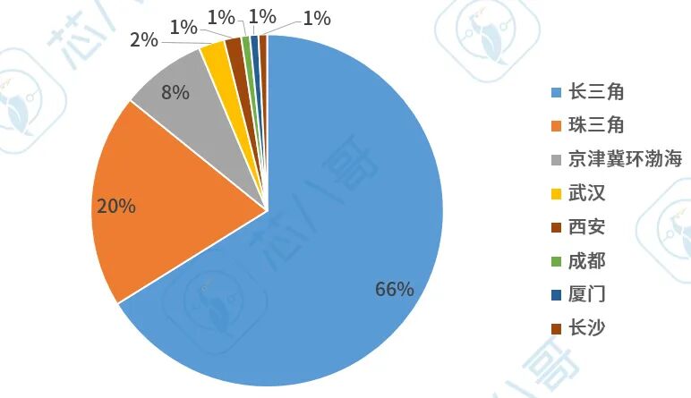 国内目前形成四个半导体产业集群,分别是以上海、无锡、苏州为代表的长三角、以深圳、广州、珠海为代表的的珠三角、以北京为中心的环渤海和以西安、武汉、成都为代表的中西部区域。长三角、珠三角地区在设计、制造、封测等产业链环节全面发展;京津冀地区的偏向集成电路设计产业;中西部地区在封测行业发展较好。今年上半年的半导体投融资在地域上呈现一家独大的特点。上半年,66% 的融资企业来自于长三角,20% 来自珠三角,大量的半导体初创企业来自这两个三角洲,合计高达 86%。京津冀环渤海地区分布着 8% 的融资企业,中西部贡献剩余的不到 6%。