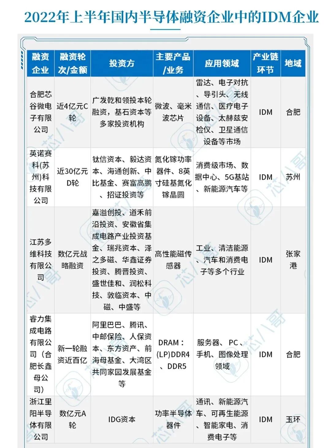 全球每年上兆亿颗的半导体产品出货中,八成由 IDM 公司公司提供,但国内半导体企业大部分是无晶圆设计企业,IDM 企业就显得尤为稀缺。作为专注于氮化镓的 IDM 企业,英诺赛科获得了近 30 亿元的 D 轮融资;合肥长鑫母公司——睿力集成电路有限公司的新一轮融资更是引来阿里巴巴、腾讯等一众国内投资大佬豪掷百亿。资料来源:各公司新闻,芯八哥整理