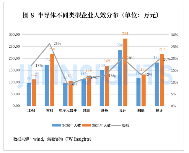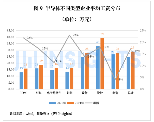 2021年,除采购和综合管理岗位,其他各岗位人数均呈正增长状态,其中销售、技术以及职能岗位涨幅均超过20%。随着行业步入高速发展周期,产业链上下游需求均得到不同程度释放,行业内公司对人才的需求日益增大,集成电路作为技术和人才密集型产业,优秀的研发和技术人员是公司保持竞争优势的关键因素。