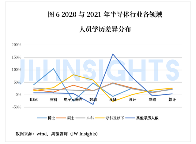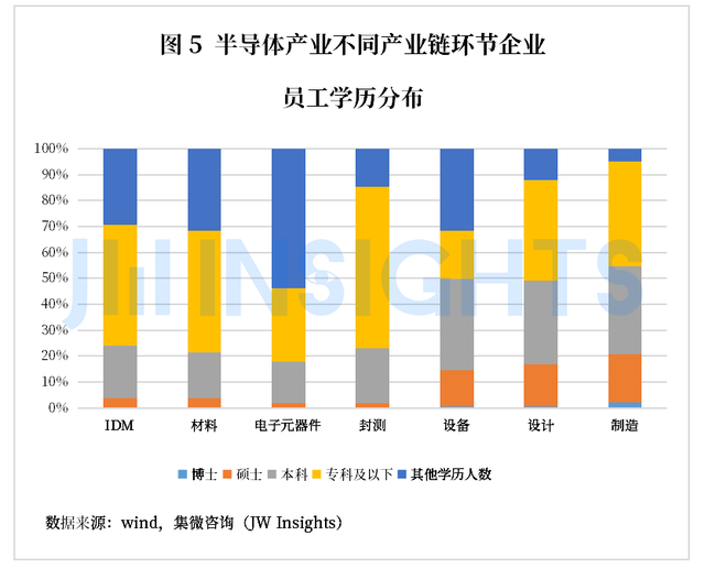 从不同产业链环节来看,目前上市公司企业数据显示,封测业对专科及以下学历需求最高(62.36%),设备领域对于本科学历需求最高(35.42%),而设计业以及高端制造业对于研究生学历需求最高。