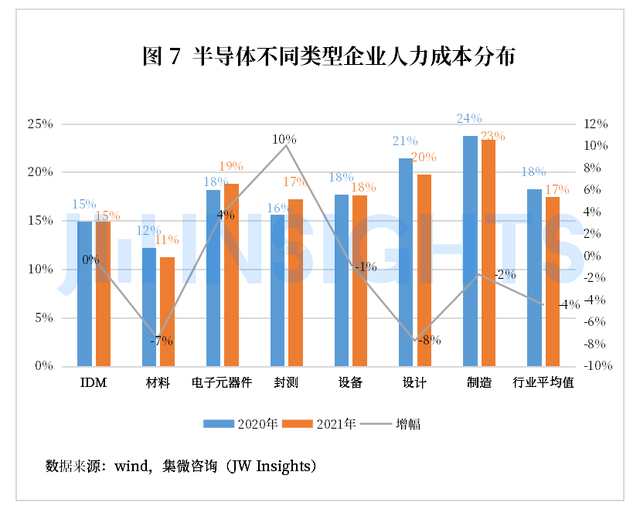 半导体产业在我国经济发展过程中扮演着至关重要的作用,国家在政策层面给与巨大支持,各地地方政府也针对行业发展投入大量的财政补贴,并在人才吸引和保留上也匹配相应的政策措施,以期能够为产业的发展提供更良好的经营环境。通过对比可以发现,2021年整体行业企业在人力成本上的支出占企业营收的比重,与2020年相比,多呈现下降趋势,平均降幅4.42个百分点。封测业人力成本呈现正增长,涨幅为10.02%,封测业企业因产业链的快速发展,在人员规模上呈现较大的扩充趋势,随着我国廉价劳动力的减少,各地平均工资不断提升,人员扩充势必也会导致企业人力成本的增加。