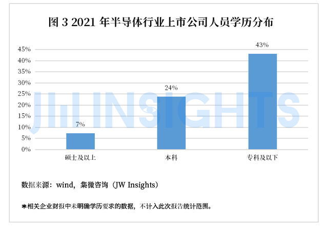 半导体行业具有产业链条长且各产业链条间又可独立成链的特点,这也使得从事半导体行业工作的人员存在较大差异,特别是占半导体产业份额八成的集成电路板块,人员学历构成差异尤为明显。上游的设计领域属于高知识密集型,也因此汇集了大量优秀院校毕业的高学历专业人才,而中下游的晶圆制造和封装测试,因工厂生产需要,对一线作业人员衡量多以其过往工作经验为主要标准,学历则不是最优先考虑因素。从上市公司人员学历数据分布来看,2021年我国半导体行业学历占比最高的为专科及以下(43.17%),本科学历(23.86%)位列第三位。