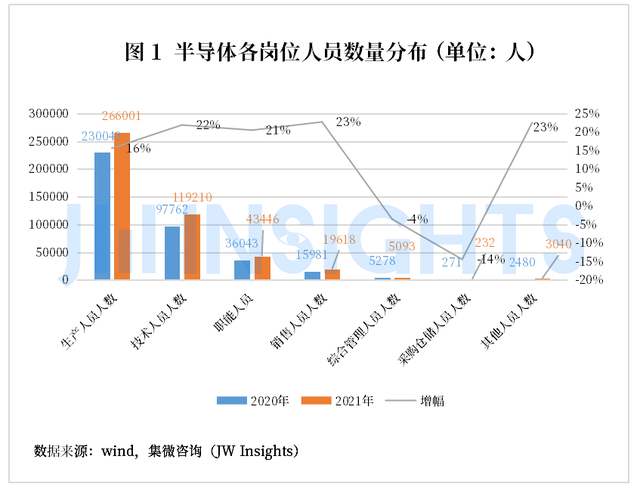 135家上市公司数据表明,2021年半导体产业从业人员为45.66万,与2020年38.85万人相比,同比增长17.54%。而从不同岗位类型来看,生产人员数量达26.60万人,位列各岗位类型人员数量占比首位,其次为技术人员,人员数量为11.92万人。