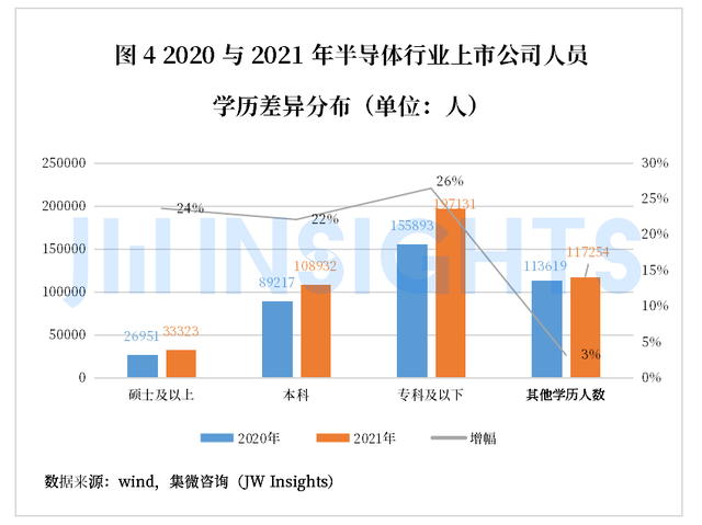 2021年半导体上市企业对于各学历结构均呈现不同程度涨幅,其中大专及以下学历涨幅最高,为26.45%,硕士及以上学历涨幅23.64%,本科学历涨幅为22.10%。