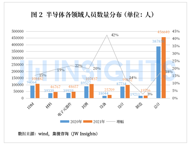 从产业链分布来看,IDM以及封测领域从业人员数量均突破10万人,设计领域人员数量9.9万人,位列第三位。与2020年各领域人员数量对比来看,设备领域人员以42.48%的涨幅居于首位,其次是电子元器件(21.83%)、封测(20.01%)。半导体设备是半导体行业产业链的关键支撑环节,更是制约我国半导体产业发展的关键因素。2021年,我国国产半导体设备的上市公司实现了跨越式发展,从产业人员大幅增长上也可以看出,我国半导体设备产业正处于高速发展状态,国产替代化进程也在不断加快。