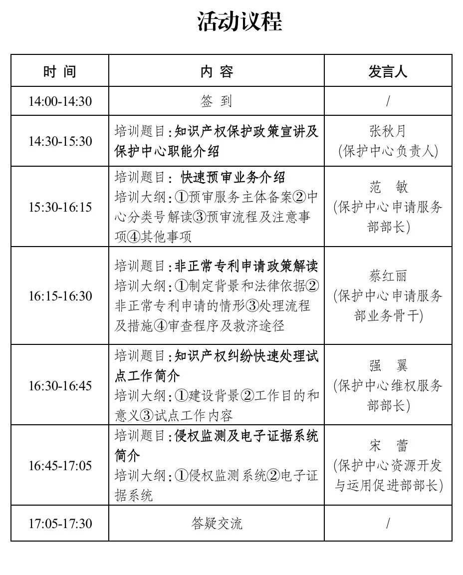 (一)知识产权保护政策宣讲及保护中心职能介绍;
