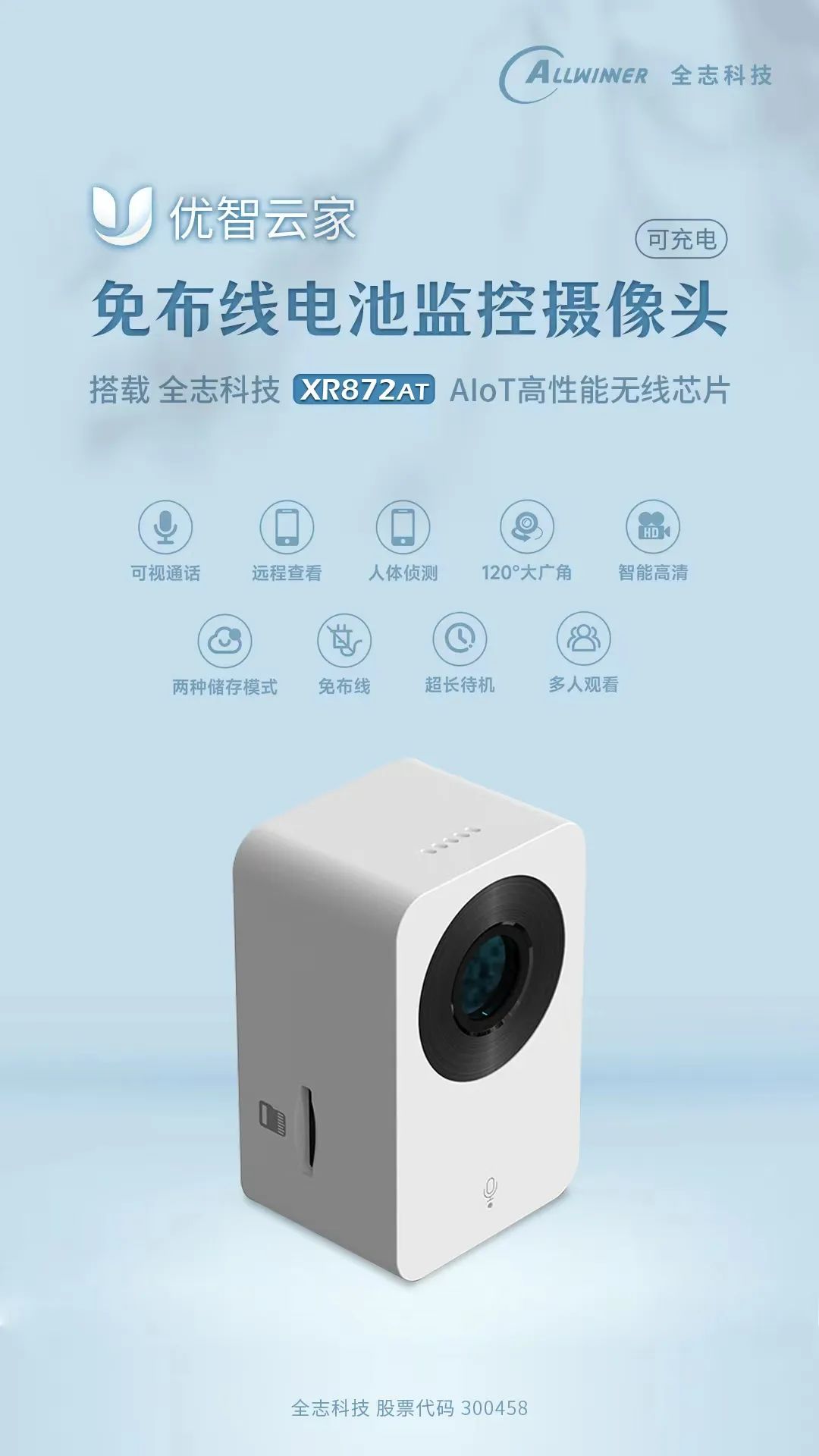 会员动态 I 搭载 全志XR872AT AIoT高性能无线芯片的优智云家 免布线电池监控摄像头 全新上市!