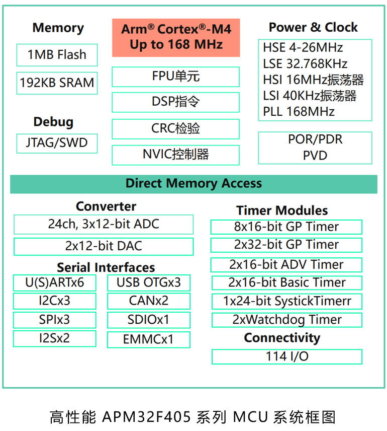 基于Arm® Cortex®-M4内核,168MHz高效CPU运算性能,支持单精度FPU、增强型DSP处理指令,内置高速1024KB Flash、192+4KB SRAM,同时支持PSRAM、NORFlash、NANDFlash等多种外部存储器。