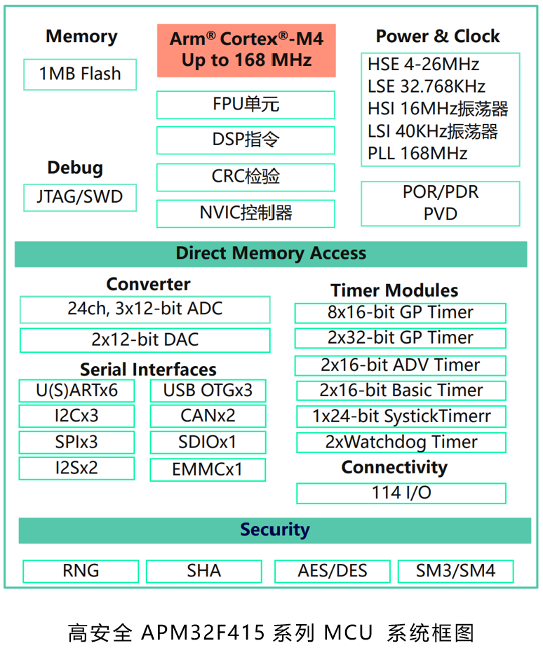 APM32F405/415系列内置真随机数发生器和HASH算法,APM32F415比APM32F405多加入安全加密相关算法模块。APM32F415系列支持AES、DES、TDES加密标准,新增国密SM3、SM4加密算法和SM2软件算法以适应国内对加密的需求,同时支持RNG、SHA-224、SHA-256、MD5等安全散列算法,有效保证用户产品信息的安全性;供电电压范围在1.8V~3.6V,搭载上电复位(POR)、掉电复位电路(PDR),以及电源电压检测器(PVD),增强芯片电源管理可靠性。