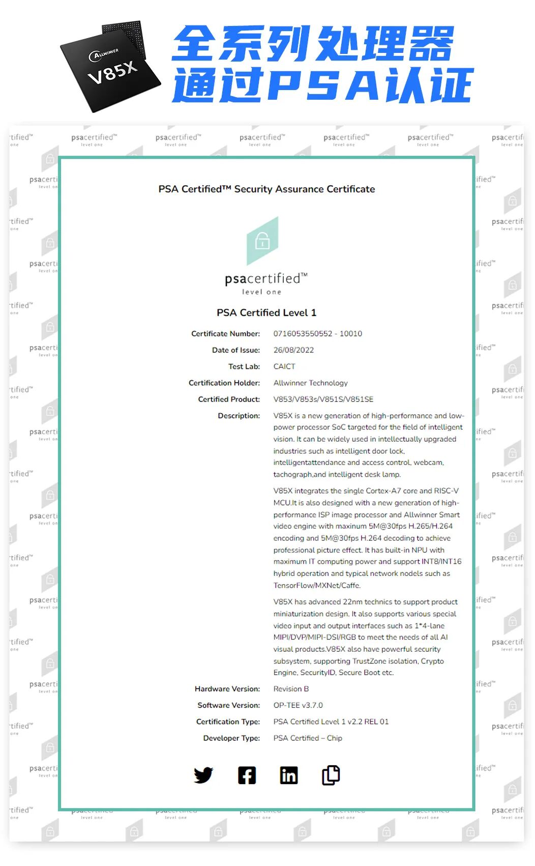 企业动态 | 全志科技V85X全系列处理器获得PSA Certified安全认证