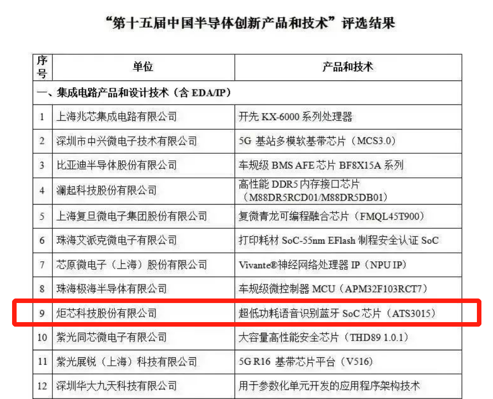 炬芯科技超低功耗语音识别蓝牙SoC芯片ATS3015,凭借其优异的产品表现,在“第十五届中国半导体创新产品和技术”评选中榜上有名。