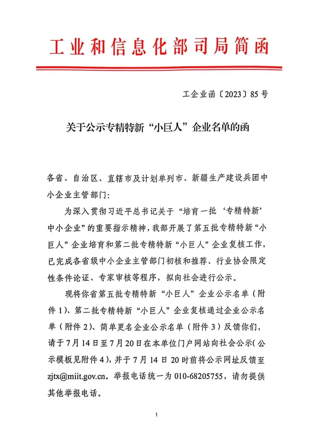 2023年7月14日,工业和信息化部中小企业局发布《关于公示专精特新“小巨人”企业名单的函》,公示原文: