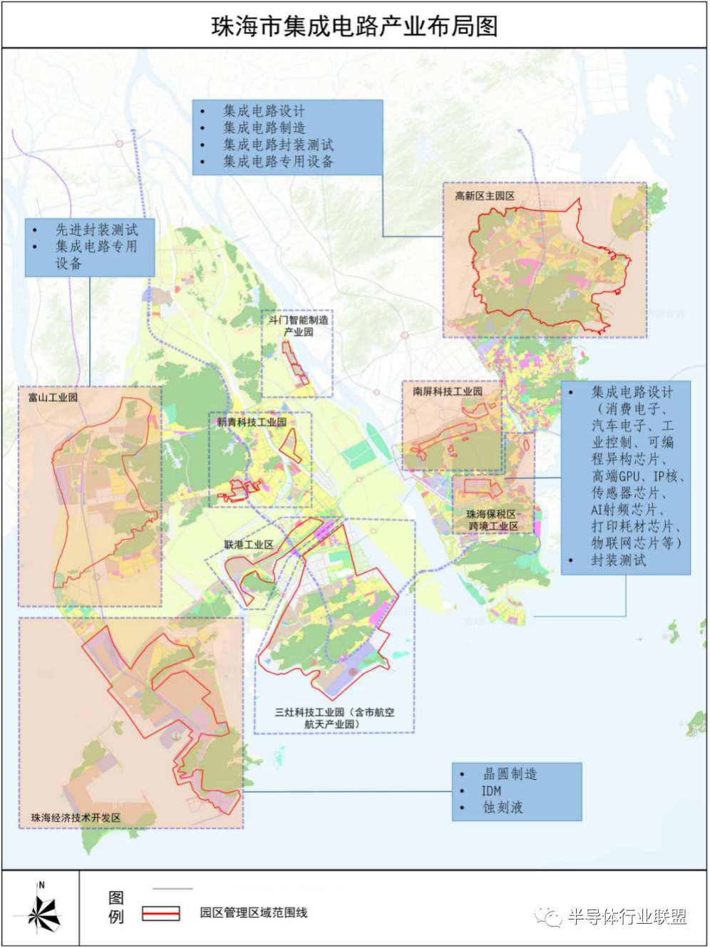 珠海市集成电路产业布局以高新区为主,香洲区、斗门区和金湾区为辅。其中,细分产业环节上,高新区重点布局集成电路设计、制造与封测以及原材料等环节,支持横琴粤澳深度合作区布局EDA工具、IP核等集成电路设计环节,香洲区重点布局集成电路新场景应用,斗门区、金湾区(珠海经济技术开发区)重点布局集成电路制造、封测和原材料环节;产业业态上高新区重点关注集成电路相关的制造+研发类型项目和功能性研发类项目,横琴粤澳深度合作区和香洲区重点关注集成电路的服务类项目,斗门区、金湾区重点关注集成电路的制造类项目。