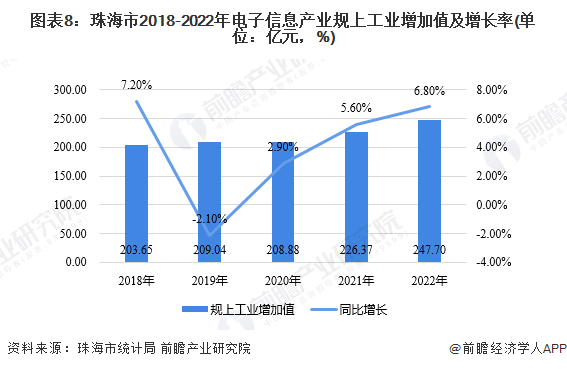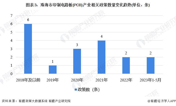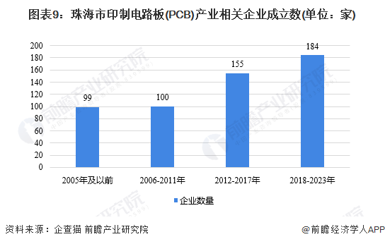 2016-2021年,中国大陆印制电路板(PCB)产业产值规模逐步上涨,增速存在一定波动。到2021年,中国大陆印制电路板(PCB)产业产值规模达到436.03亿美元,同比增长24.5%。我国印制电路板(PCB)产业链主要分为上游原材料、中游制造以及下游应用三个方面,其中玻璃纤维布、覆铜板、铜箔的毛利率较高,中游PCB制造的毛利率为20%-30%,下游应用领域十分广泛,各行业毛利率差异较大,故不做具体说明。珠海市在2002年发布的《 “十五”国民经济和社会信息化规划》便有提及到印制电路板(PCB)产业,由此可见该产业在珠海有一定的发展历史,自2020年以来,相关政策提及次数有所上升,由此可见印制电路板(PCB)产业的政策支持力度有所加强。2022年12月,珠海市印发《珠海市制造业高质量发展“十四五”规划》,对PCB产业提出了相应的发展要求。印制电路板(PCB)产业链主要环节有上游原材料、中游制造以及下游应用。根据企查猫查询的珠海市印制电路板(PCB)产业链相关企业,珠海市在印制电路板(PCB)产业链各环节均有产业分布,其中分布企业数量较多的环节为中游PCB制造。珠海市三个行政区均有印制电路板(PCB)产业相关企业分布。其中,香洲区代表企业有紫翔电子、格力集团等,斗门区代表企业有中京电子、越亚半导体、杰赛科技、冠宇电池等,金湾区代表企业有宏昌电子、崇达电路等。(3)珠海市印制电路板(PCB)产业链发展载体图谱根据《珠海市制造业高质量发展“十四五”规划》,斗门区(富山工业园)重点布局高端PCB,因此可以看到富山工业园内布局了许多PCB项目,金湾区的项目主要布局在高栏港经济区,香洲区的项目较少,主要布局在高新区内。根据珠海市统计局数据,珠海市2023年1-3月新一代信息技术产业增加值为46.24亿元。根据《2022年珠海市国民经济和社会发展统计公报》,2022年珠海市新一代信息技术业产业增加值较2021年增长了3.1%。从电子信息产业的发展情况来看,根据珠海市统计局官网的数据,2018年电子信息产业累计规上工业增加值203.65亿元,同比增长7.2%;2019年累计完成209.04亿元,同比下降2.1%;2020年累计完成208.88亿元,同比增长2.9%;2021年累计完成226.37亿元,同比增长5.6%;2022年累计完成247.70亿元,同比增长6.8%。可见珠海市电子信息产业近年来保持较好发展势头。(注:因印制电路板产业相关数据缺失,故以电子信息产业估计印制电路板产业的发展情况)企查猫查询的珠海市印制电路板(PCB)相关企业共538家,其中2005年之前成立企业99家,2006-2011年期间成立的企业100家,2012-2017年期间成立企业155家,2018年至今成立企业184家,可见近五年来珠海市印制电路板(PCB)产业相关企业数量在逐渐增长。根据珠海市人民政府信息公开目录,珠海市电路板产业主要集聚在富山工业园和高栏港经济区,至2025年产值发展目标分别为500亿元和390亿元,合计890亿元,产量目标分别为3851万平方米/年和2800万平方米/年,合计6651万平方米/年。根据《珠海市制造业高质量发展“十四五”规划》,珠海市PCB发展路径一是加大针对性招商引资力度,重点构建高端打印设备完整产业链,二是实施“创新强企”战略,把握信创市场发展机遇,着力在高端PCB等优势领域锻造产业长板。根据珠海市人民政府信息公开目录,珠海市电路板产业发展明确了三个战略定位:一是打造国内外知名的千亿级电路板产业基地;二是构建5G信息产业生态圈;三是打造高质量电路板产业“无废示范区”。