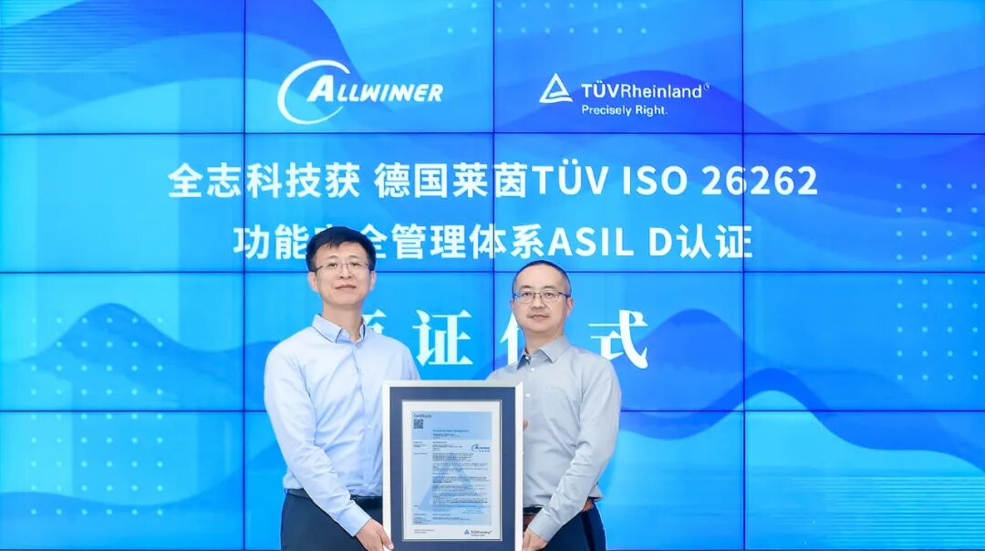 近日,珠海全志科技股份有限公司(以下简称“全志科技”)获得国际独立第三方检测、检验和认证机构德国莱茵TÜV集团(以下简称“TÜV莱茵”)颁发的“ISO 26262功能安全管理体系最高等级ASIL D认证”证书。TÜV莱茵大中华区工业服务与信息安全总经理赵斌、助理大客户经理詹丽龙,全志科技CTO丁然、质量中心总监熊振武等双方代表出席了本次颁证仪式。