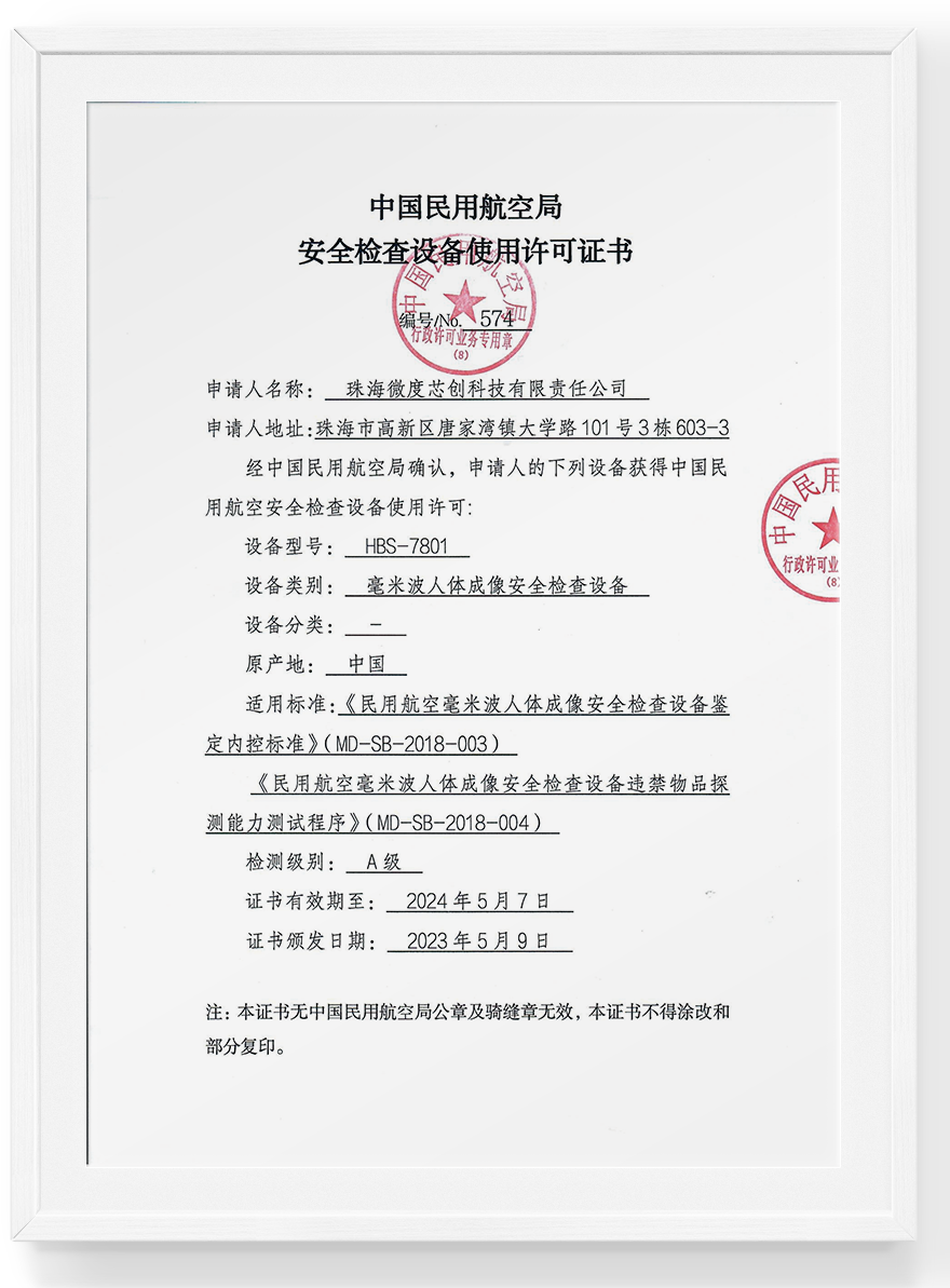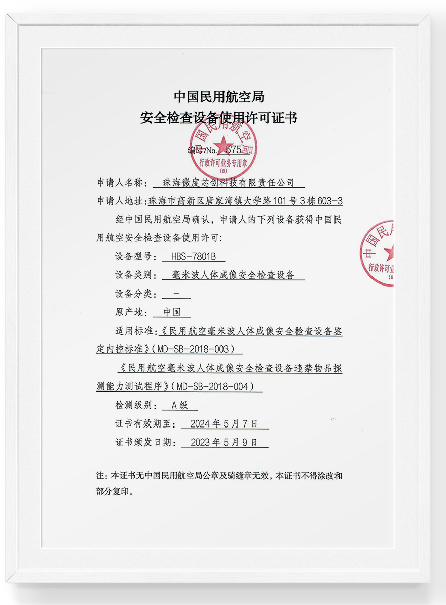 2023年5月9日,珠海微度芯创科技有限责任公司(以下简称“微度芯创”)的两款毫米波人体安检仪(HBS-7801/HBS-7801B)全部通过国内最高级别的中国民用航空局A级认证,获得《中国民用航空安全检查设备使用许可》证书,代表着微度芯创毫米波人体安检仪的稳定性和可靠性已达到民航行业的最高标准。