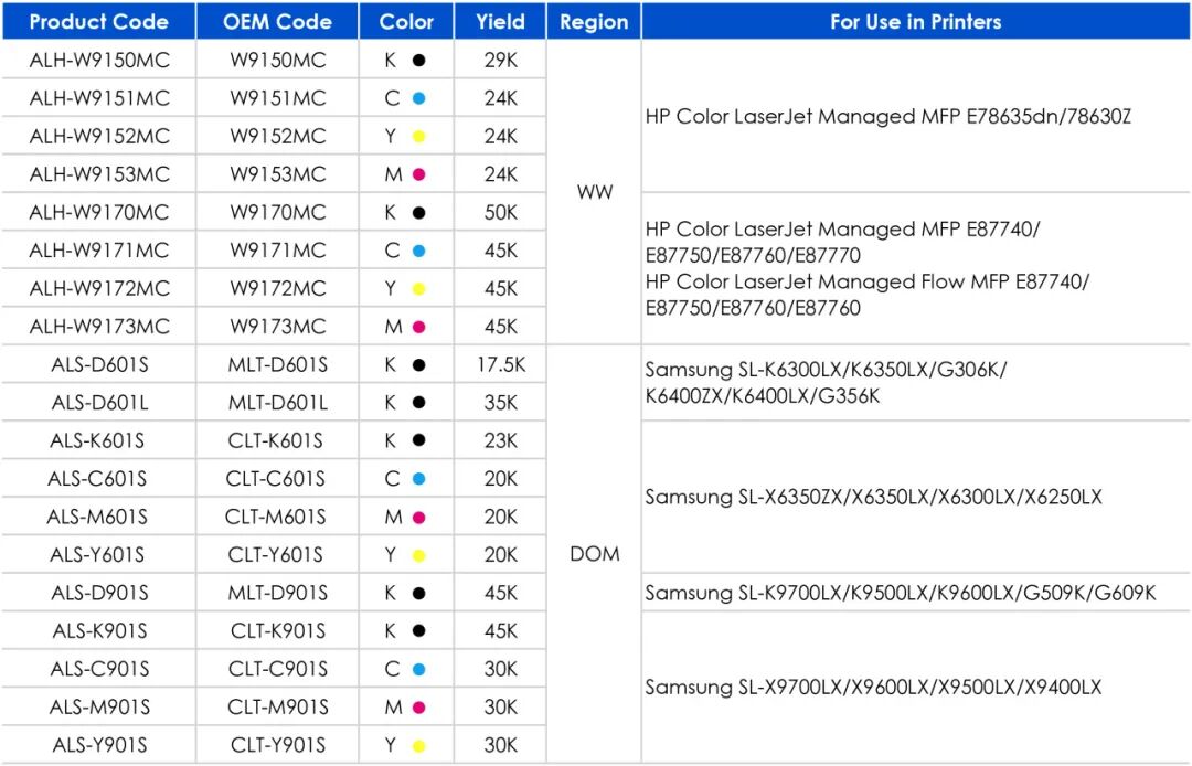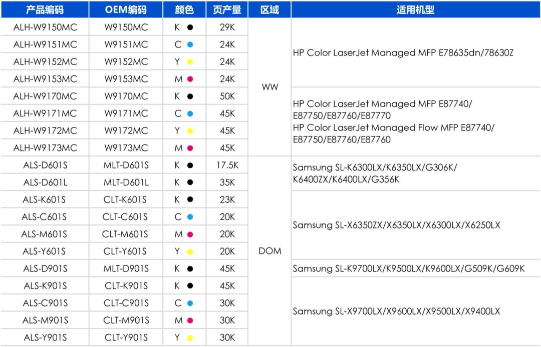 适用于惠普W9150MC/W9170MC及三星601/901系列粉盒的可替代芯片现已正式上市,快来咨询您的客户经理,挖掘芯商机!