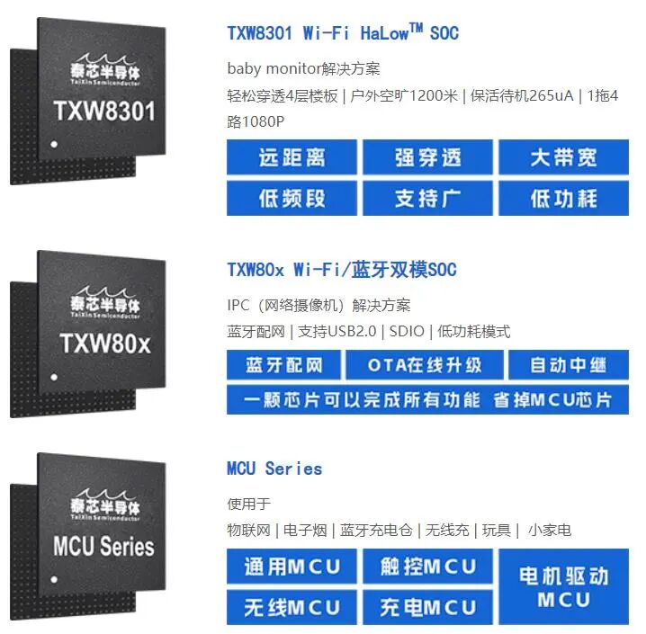 珠海泰芯半导体有限公司是一家专注于人工智能物联网领域的集成电路设计的高新技术企业,公司同时拥有多模无线连接技术、音视频处理和人工智能算法技术;是全球首家实现远距离低功耗Wi-Fi HalowTM芯片量产的公司,先后研发并量产了Wi-Fi HalowTM芯片、高性价比Wi-Fi4和Wi-Fi6芯片、无线微控制器芯片,以上芯片广泛应用于安防监控、物联网、智能家电、消费电子、工业互联网等领域。